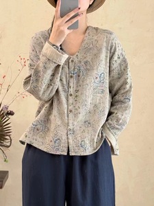 2025秋款复古棉麻印花开衫外套V领长袖宽松外搭开衫文艺休闲上衣