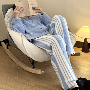甜美撞色条纹珊瑚绒睡衣女秋冬季加厚保暖半边绒家居服套装可外穿