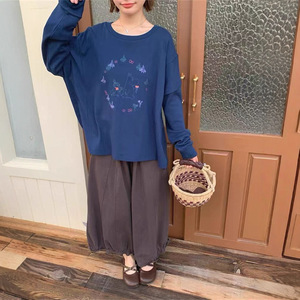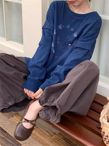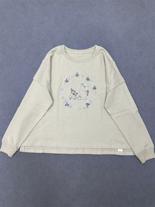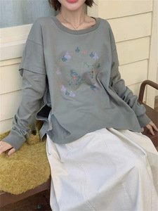 日系可爱姆明刺绣全棉圆领宽松套头卫衣 拼接开叉休闲上衣女装