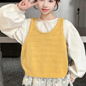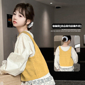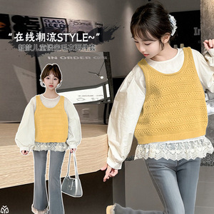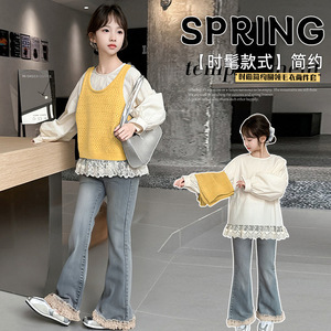 女童衬衫马甲牛仔裤套装2025春秋款蕾丝花边上衣针织背心微喇裤裤