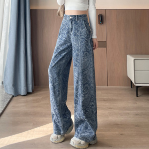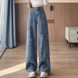 2522棕色提花阔腿牛仔裤女2025年秋季新款流行爆款遮跨直筒拖地裤