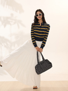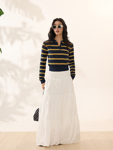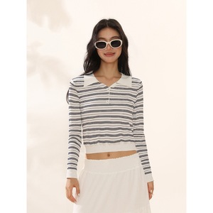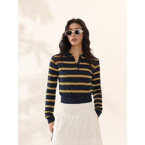 撞色条纹Polo领长袖T恤女早秋休闲百搭显瘦短款上衣