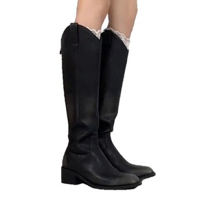 牛皮版~靴子女长筒靴2025新款擦色V口宽筒显瘦后拉链粗跟骑士靴子