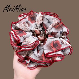 复古红色印花包边雪纺肥肠圈2025高级感丸子头绳发绳高弹皮筋发圈