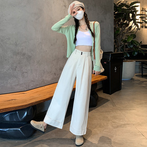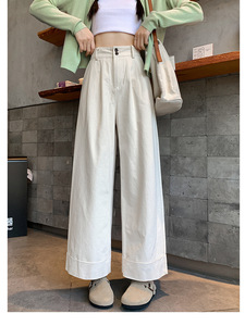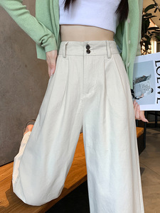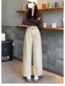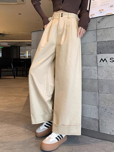 卡其色洗水棉工装阔腿裤女春秋小个子休闲宽松垂感卷边九分直筒裤