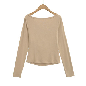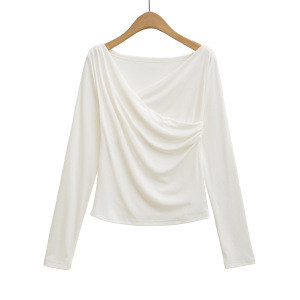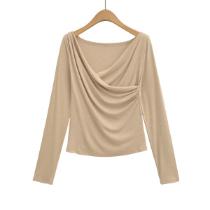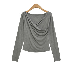 CL25124-25秋季新款 美式纯欲风大V领露肩皱褶长袖打底衫上衣T恤