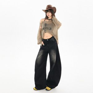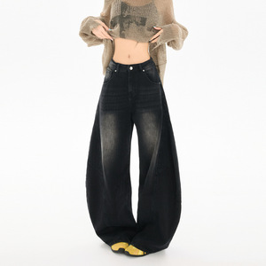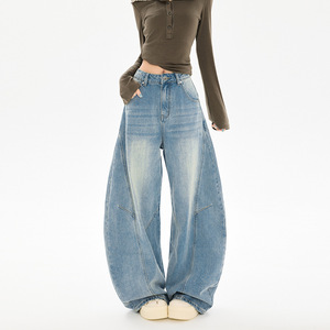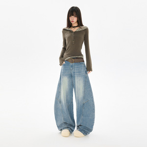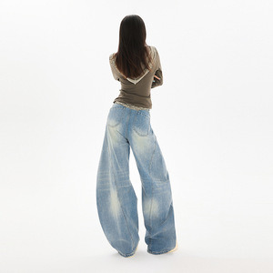 【今茵】2色/美式时尚复古宽松廓形牛仔裤水洗压褶立体裁剪弯刀裤