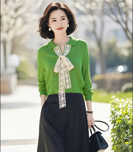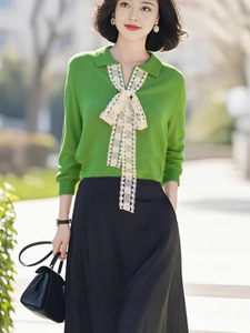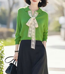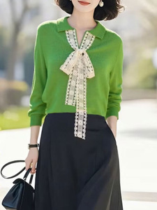 2025秋季大码女装新款设计感蕾丝蝴蝶结长袖针织衫