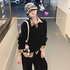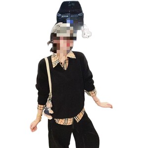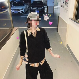 黑色格子拼接领卫衣女春秋冬2025新款设计感小众上衣