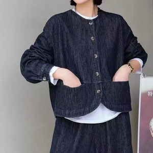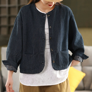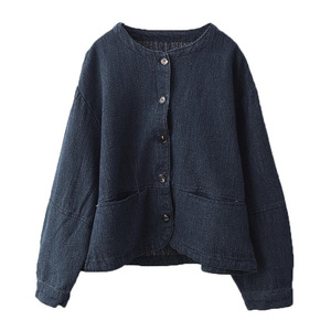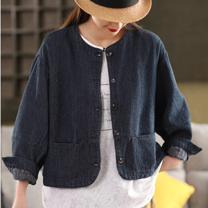 复古双层色织短外套女高棉含量圆领长袖单排扣外搭春款休闲开衫