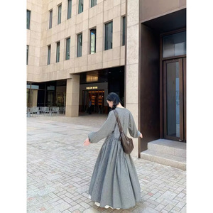 亚麻格子裙女禅意早秋新款复古长袖设计感连衣裙禅修
