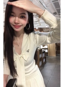 法式优雅小香风米白色蝴蝶结围巾领T恤秋冬设计感坑条修身上衣女