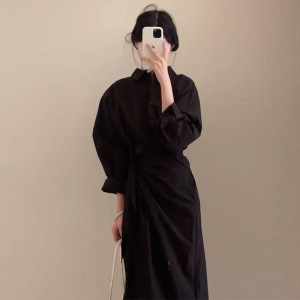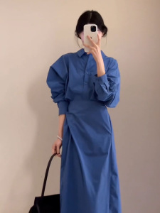 早秋穿搭蓝色长袖衬衫连衣裙子女秋季2025新爆款高级感套装长裙