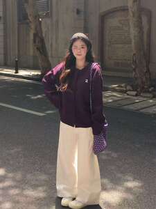 韩系慵懒风超显白紫色毛衣开衫外套女秋季休闲宽松针织开衫上衣冬