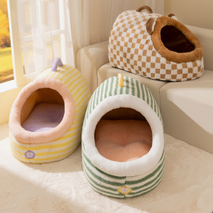 狗窝萌趣半封闭手提猫窝加厚保暖狗床弧形房子窝经典条纹宠物窝