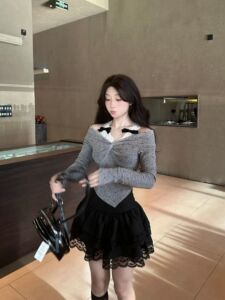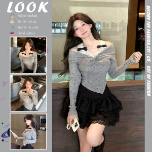 波点蕾丝拼接t恤女春秋韩系长袖蝴蝶结修身显瘦别致露肩打底上衣