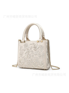 z2025珍珠绣花时尚手提包丝缎质感硬质包轻奢花卉刺绣辣条单肩包