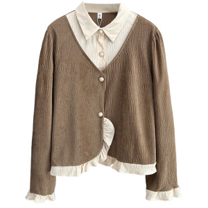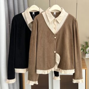 大码女装韩版秋季新款气质衬衫领假两件上衣200斤胖妹妹小衫8324