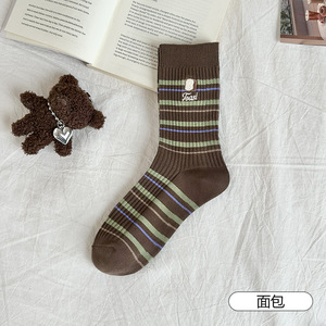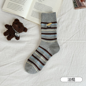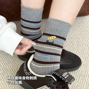趣味刺绣袜子女秋冬拼色条纹潮流弹力中筒袜棉质吸汗透气堆堆袜
