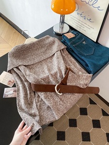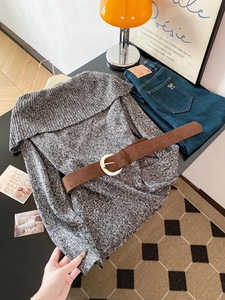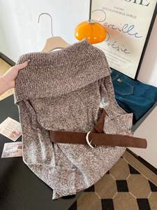 秋季法式复古时髦百搭一字肩套头针织毛衣衫显瘦上衣女配皮带