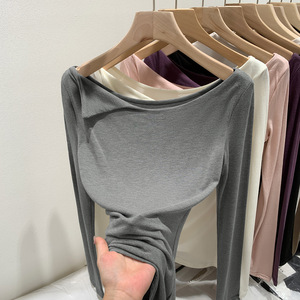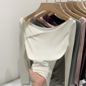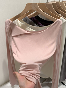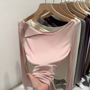 斜肩露肩不规则设计感小众粉色长袖T恤女早秋2025新款巨好看上衣