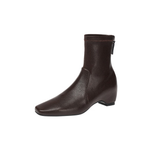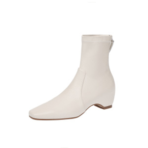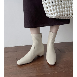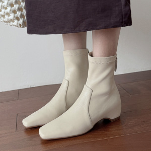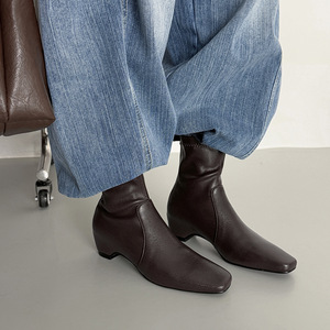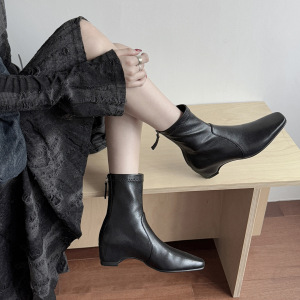 韩系简约百搭秀气内增高瘦瘦靴2025秋冬中跟方头羊皮弹力小短靴女