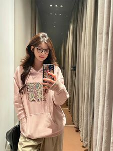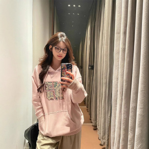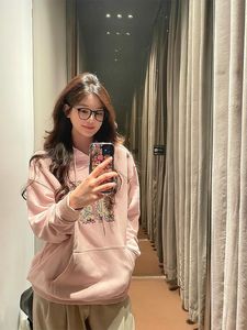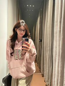 美式复古贴布刺绣连帽卫衣女早秋休闲薄款宽松潮牌设计感小众粉色