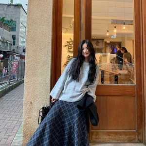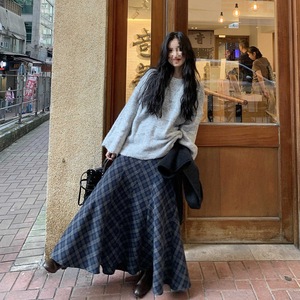 斜纹蓝灰格纹磨毛半身裙女2025新款秋早秋加厚A字裙
