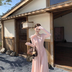 温柔风蝴蝶结挂脖露背连衣裙女2025秋季新款收腰显瘦减龄A字长裙