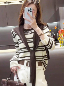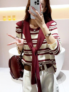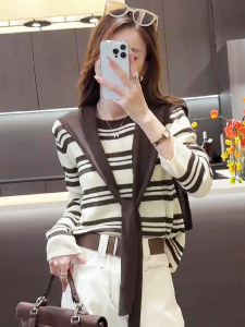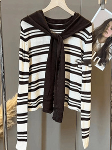 早秋条纹披肩假两件针织衫女2025新款春秋款宽松慵懒风初秋上衣女