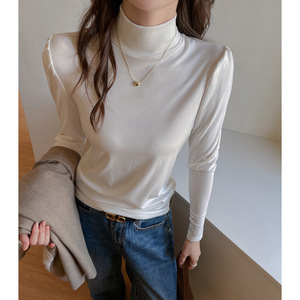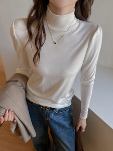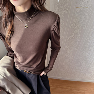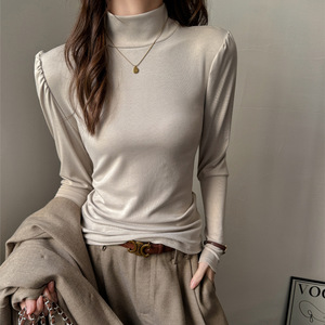 天丝莱赛尔半高领泡泡袖显肩宽长袖t恤女秋冬内搭打底衫外穿上衣