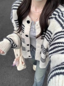 韩系黑白条纹小香风外搭毛衣外套慵懒针织衫春秋季短款宽松开衫女