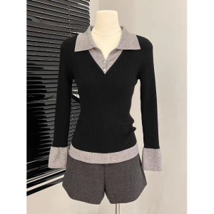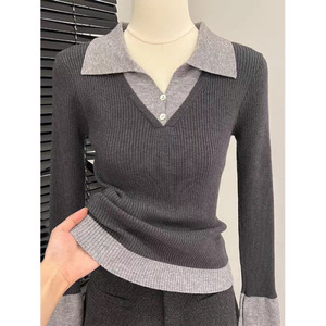 撞色假两件长袖T恤女早秋女装2025新款拼接针织打底衫Polo领上衣