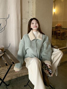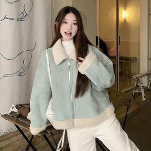 鹿皮绒复合羊驼绒 冬款外套女小众浅蓝色翻领短款羊羔毛卫衣绒衫