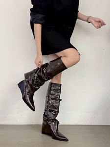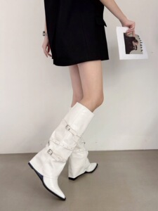 辣妹风尖头坡跟长筒靴女2025年新款铆钉皮带扣不过膝高跟裤管长靴