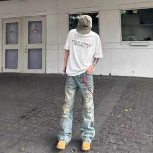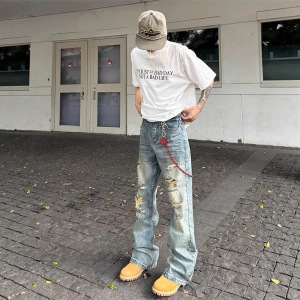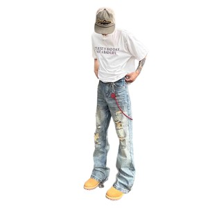 2025年潮牌牛仔裤男士修身直筒破洞复古痞帅乞丐做旧长裤流行