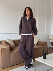 跨境休闲欧美女士含棉套装拉链翻领口袋卫衣系带直筒阔腿裤二件套