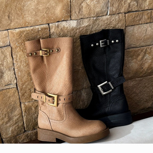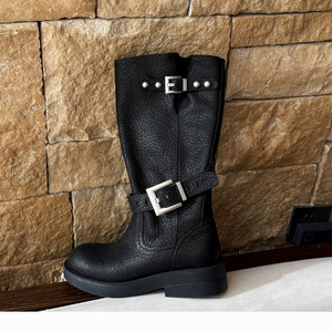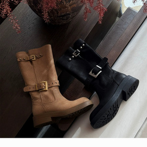 (现货)复古英伦风皮带扣中筒靴女新款显瘦粗跟圆头百搭马丁靴骑士