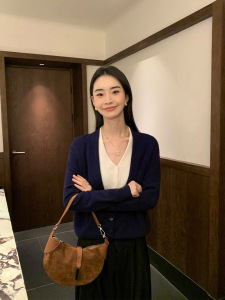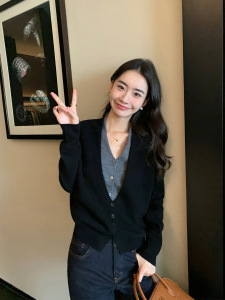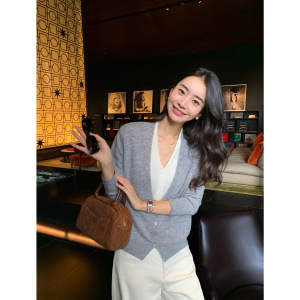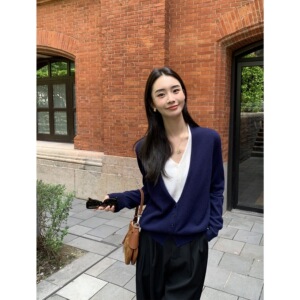 pusumede层次感美学 假两件v领针织开衫女100%毛衣外套上衣