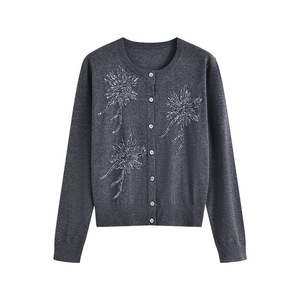 小香风圆领长袖羊毛针织开衫女2025年秋季新款设计感亮片花朵上衣