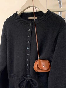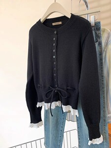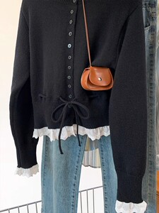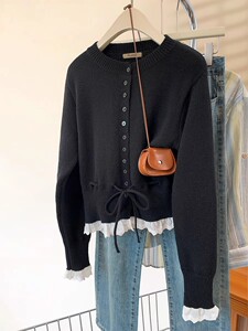 黑色假两件蕾丝针织毛衣女早秋季内搭收腰小个子短款开衫外套上衣
