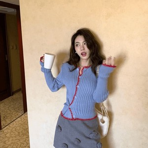 渔渔2025新款法式撞色单排扣针织开衫女冬季新款气质收腰打底上衣