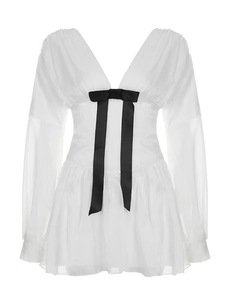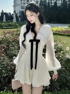 法式气质V领蝴蝶结衬衫连衣裙女夏季新款高级感收腰显瘦a字短裙子