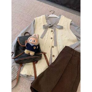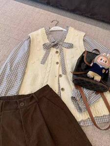 25秋新款两件套日系学院复古小个子蝴蝶结格纹长袖衬衫杏色针织衫