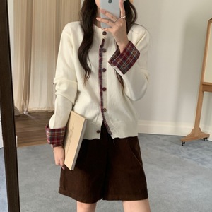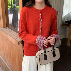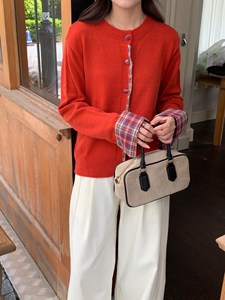 实拍 假两件韩系显瘦圆领拼接格子毛衣女装秋冬新款宽松休闲开衫