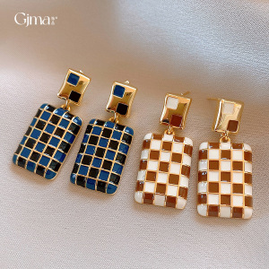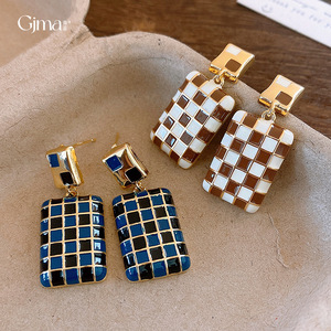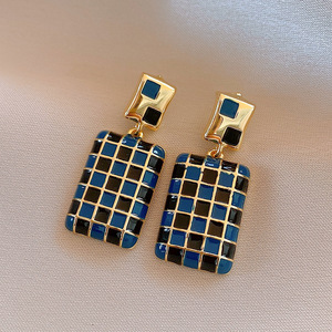 银针秋冬复古滴油格纹方形耳环轻奢高级感耳钉百搭个性港风耳饰女