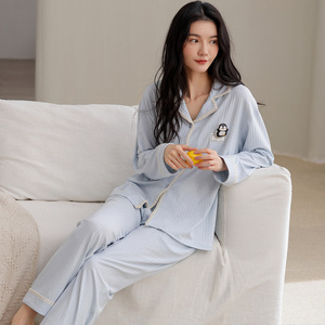 纯棉双面40支抽条200克睡衣女秋季长袖长裤纯色可外穿家居服韩版