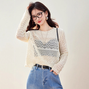 镂空钩花长袖针织衫女2025夏季新款宽松休闲气质外搭百搭罩衫上衣