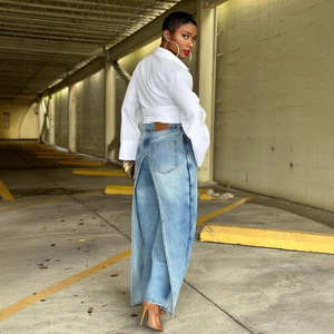 YL2570欧美女装时尚洗水炒雪花直筒宽松拼接假两件牛仔长裤
