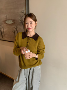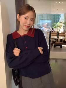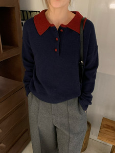 miu里miu气韩系复古撞色Polo领保暖毛衣女秋冬新款宽松针织上衣